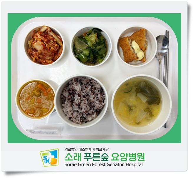 ▷ 2월 2일 중식 : 백미밥(죽/잡곡밥) / 콩가루배춧국 / 카레소스 / 생선까스&타르소스 / 청경채굴소스볶음 / 김치 ◁