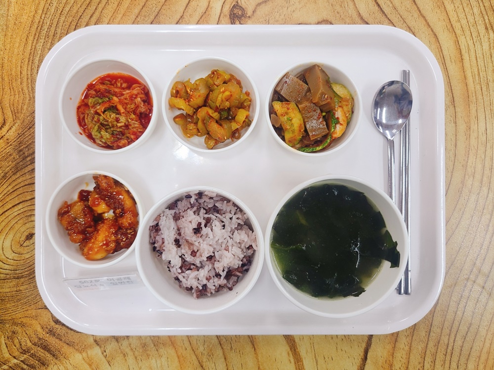 05월 23일 중식은 < 백미밥(죽/잡곡밥) / 북어채미역국 / 양념치킨 / 도토리묵야채무침 / 오이지무침 / 김치 > 였습니다.