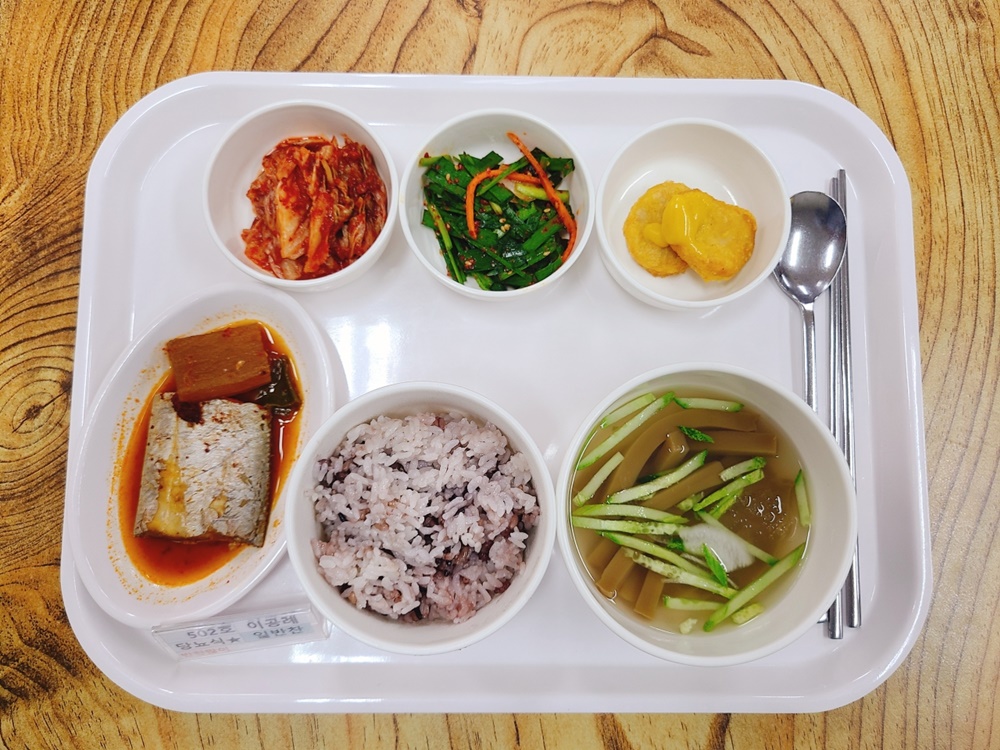 05월 30일 중식은 < 백미밥(죽/잡곡밥) / 냉도토리묵국 / 갈치무조림 / 치킨너겟&머스타드 / 부추양파무침 / 김치 > 였습니다.