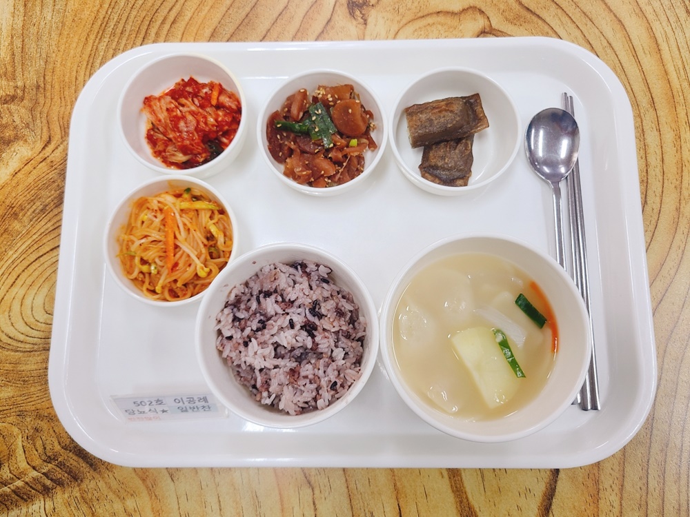 05월 31일 중식은 < 백미밥(죽/잡곡밥) / 수제비국 / 메밀전병 / 쫄면야채무침 / 오복지무침 / 김치 > 였습니다.
