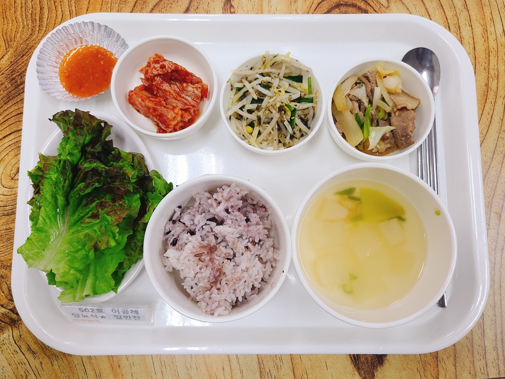 06월 05일 중식은 < 백미밥(죽/잡곡밥) / 북어채무국 / 쭈꾸미돈육볶음 / 상추쌈&쌈장 / 콩가루김가루무침 / 김치 > 였습니다.