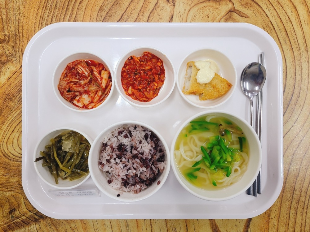05월 2일 중식은 < 백미밥(죽/잡곡밥) / 바지락칼국수 / 생선까스&콘소스 / 고구마순된장지짐 / 오징어젓갈무침 / 김치 > 였습니다.