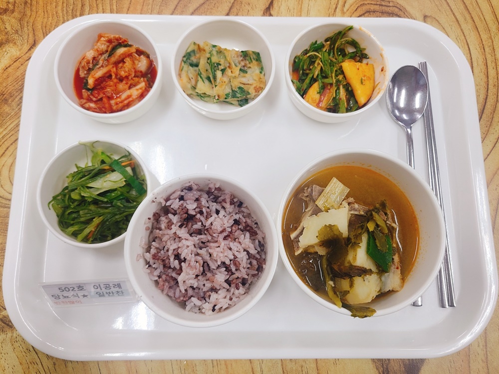 05월 9일 중식은 < 백미밥(죽/잡곡밥) / 돈등뼈감자탕 / 해물부추전 / 돌나물사과무침 / 미역줄기볶음 / 김치 > 였습니다.