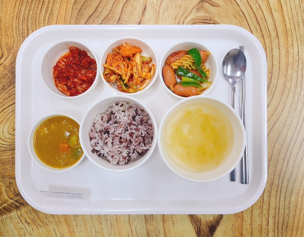05월 12일 중식은 < 백미밥(죽/잡곡밥) / 다시마무채국 / 카레소스 / 비엔나푸실리칠리소스볶음 / 도라지오이생채 / 김치 > 였습니다.