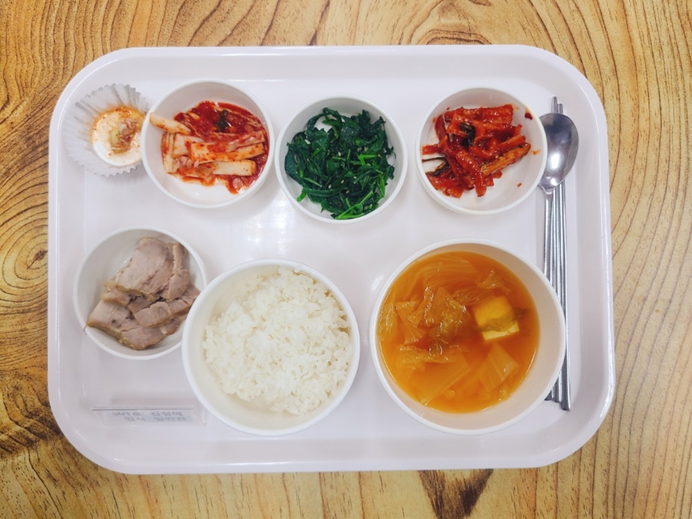 05월 15일 중식은 < 백미밥(죽/잡곡밥) / 두부김치국 / 돈수육&새우젓 / 취나물무침 / 무말랭이무침 / 김치 > 였습니다.
