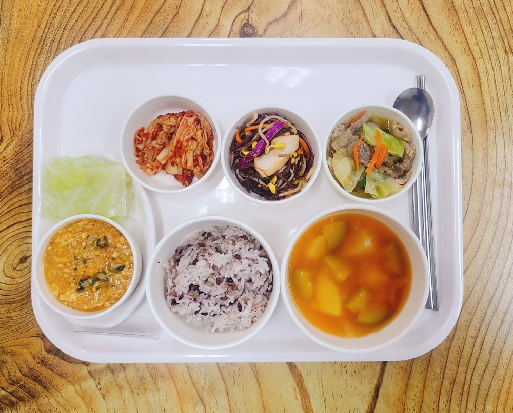 04월 07일 중식은 < 백미밥(죽/잡곡밥) / 감자호박고추장찌개 / 파채돈불고기 / 양배추쌈&우렁쌈장 / 꼬시래기콩나물무침 / 김치 > 였습니다.