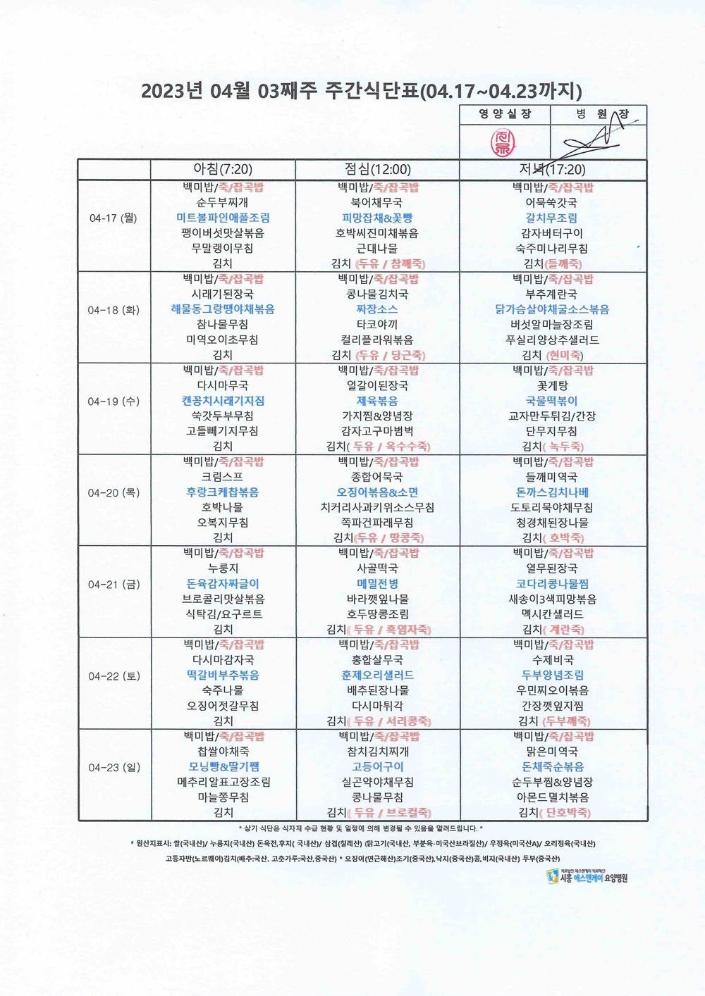 2023년 4월 3째주 주간식단표