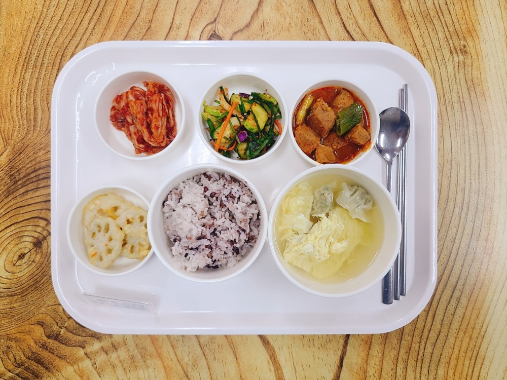 04월 24일 중식은 < 백미밥(죽/잡곡밥) /물만두국 / 매콤돈육새송이장조림 / 건새우연근튀김 / 오이부추무침 / 김치 > 였습니다.