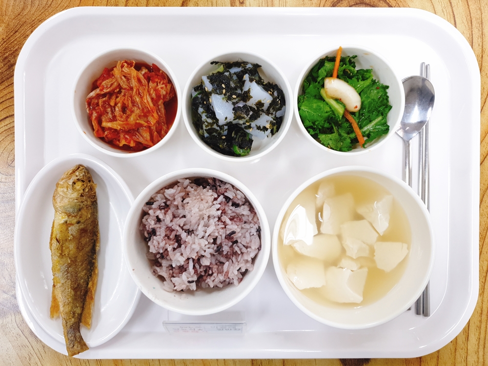 03월 20일 중식은 < 백미밥(죽/잡곡밥) / 순두부찌개 / 조기구이 / 청포묵김무침 / 치커리겉절이 / 김치 > 였습니다.