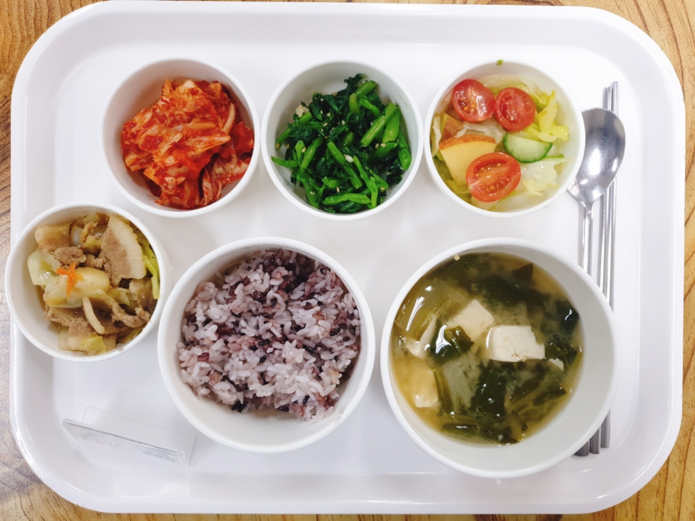 03월 21일 중식은 < 백미밥(죽/잡곡밥) / 근대된장국 / 삼겹살마늘야채볶음 / 양상추과일샐러드 / 쑥갓나물 / 김치 > 였습니다.