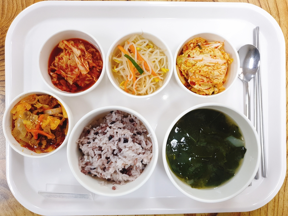 03월 24일 중식은 < 백미밥(죽/잡곡밥) / 시금치된장국 / 돈불고기 / 알배추겉절이 / 콩나물무침 / 김치 > 였습니다.