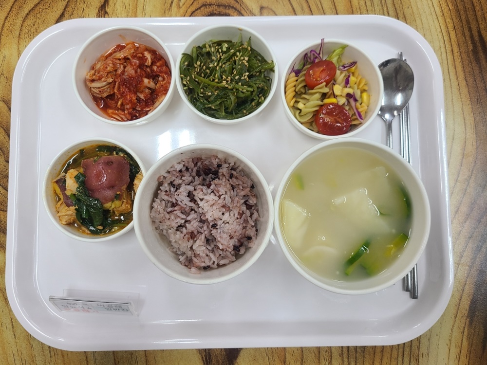 04월 03일 중식은 < 백미밥(죽/잡곡밥) / 수제비국 / 춘천닭갈비 / 푸실리양상추샐러드 / 미역줄기볶음 / 김치 > 였습니다.