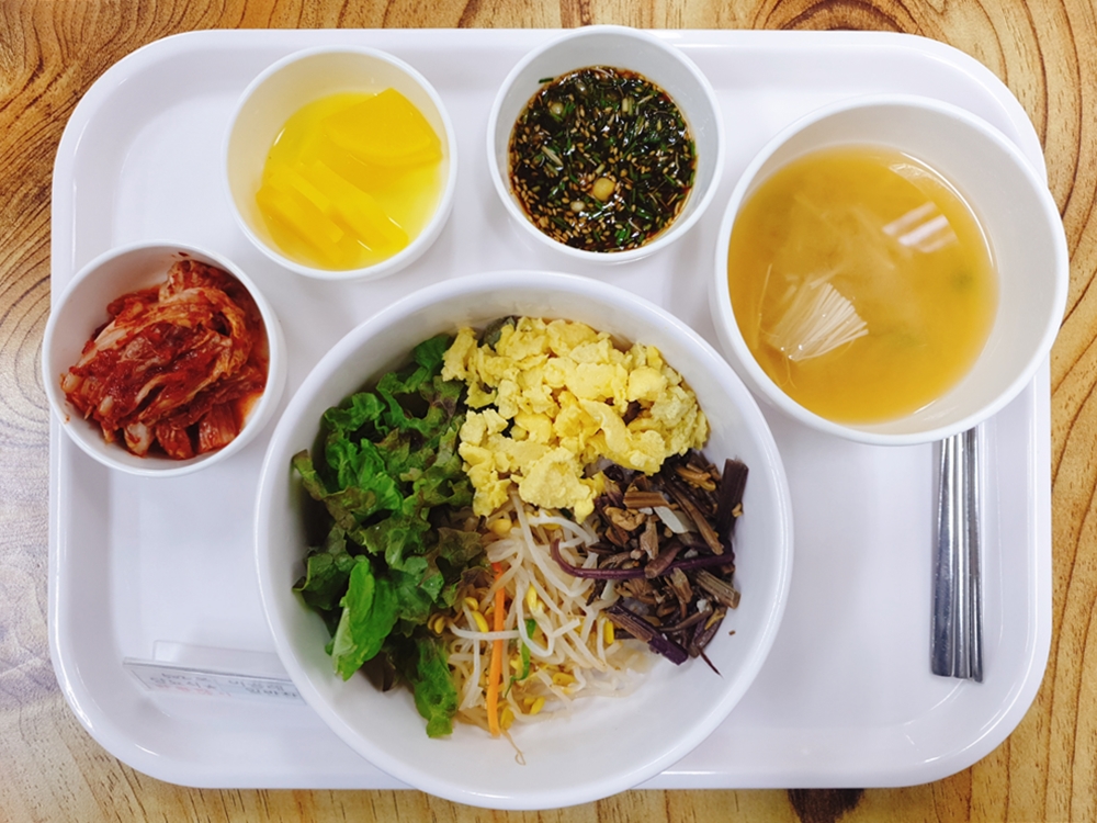 03월 03일 중식은 < 백미밥(죽/잡곡밥) / 유부된장국 / 비빔밥 / 콩나물,고사리,상추,계란소보로 / 달래양념장 / 단무지무침 / 김치 > 였습니다.