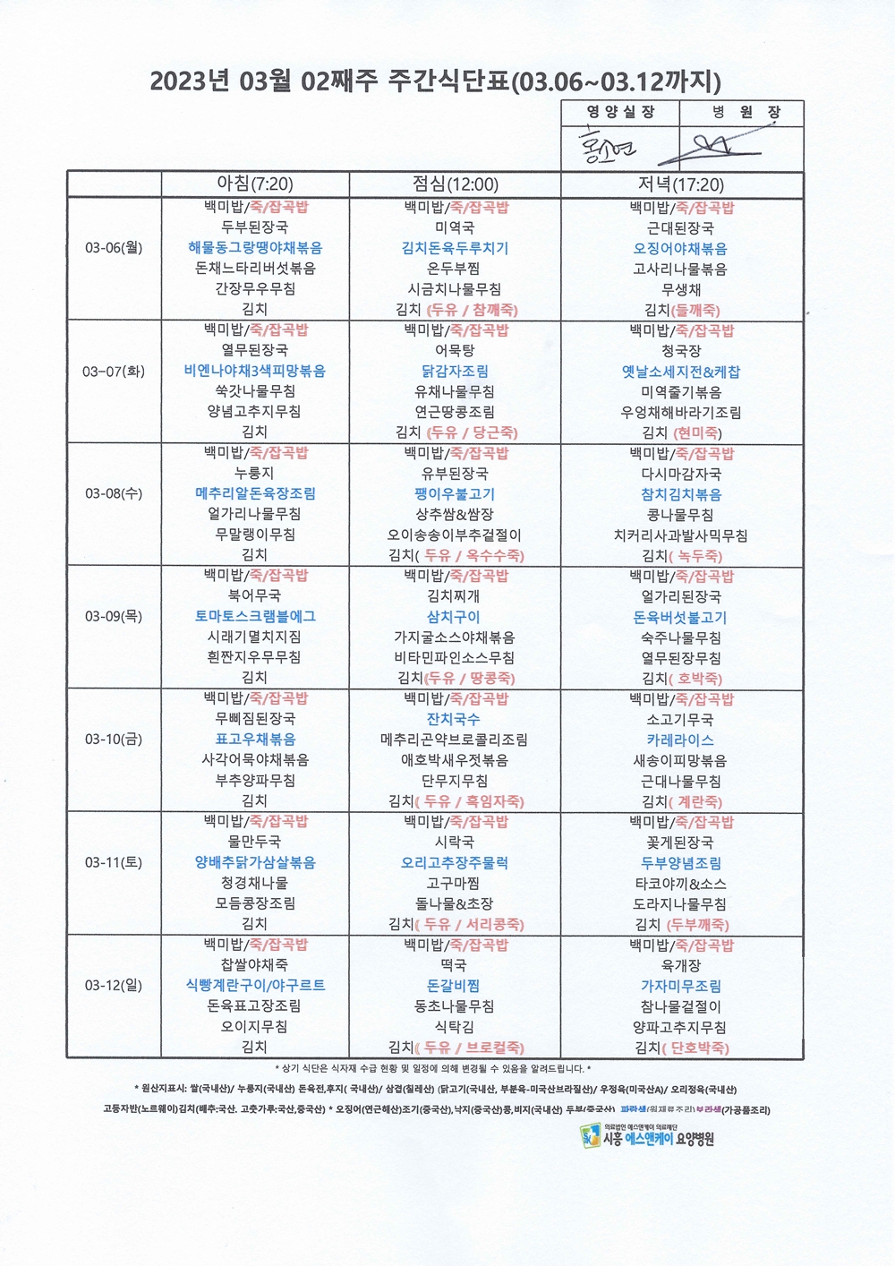 HOME > 병원소식 > 영양식단표
