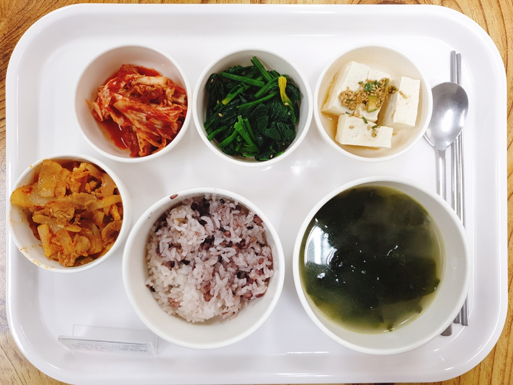 03월 06일 중식은 < 백미밥(죽/잡곡밥) / 미역국 / 김치돈육두루치기 / 온두부찜 / 시금치나물무침 / 김치 > 였습니다.
