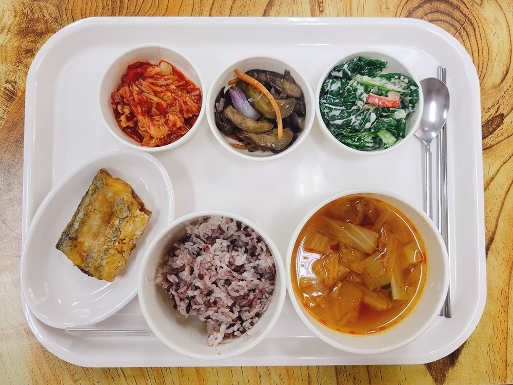 03월 09일 중식은 < 백미밥(죽/잡곡밥) / 김치찌개 / 삼치구이 / 가지굴소스야채볶음 / 비타민파인소스무침 / 김치 > 였습니다.