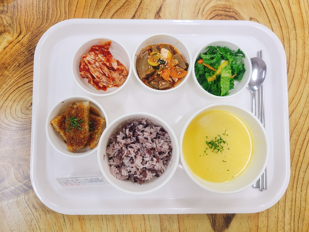 03월 15일 중식은 < 백미밥(죽/잡곡밥) / 옥수수크림스프 / 돈까스&소스 / 도토리묵야채무침 / 치커리유자청무침 / 김치 > 였습니다.