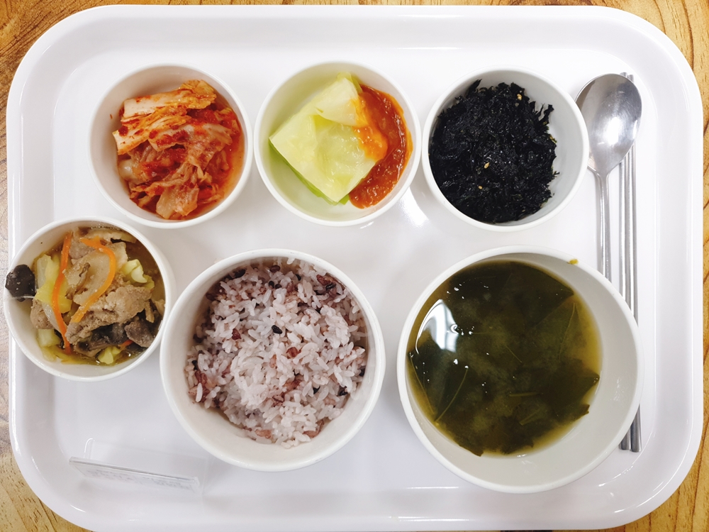 02월 10일 중식은 < 백미밥(죽/잡곡밥) / 아욱된장국 / 간장불고기 / 양배추쌈&쌈장 / 건파래자반볶음 / 김치 > 였습니다.