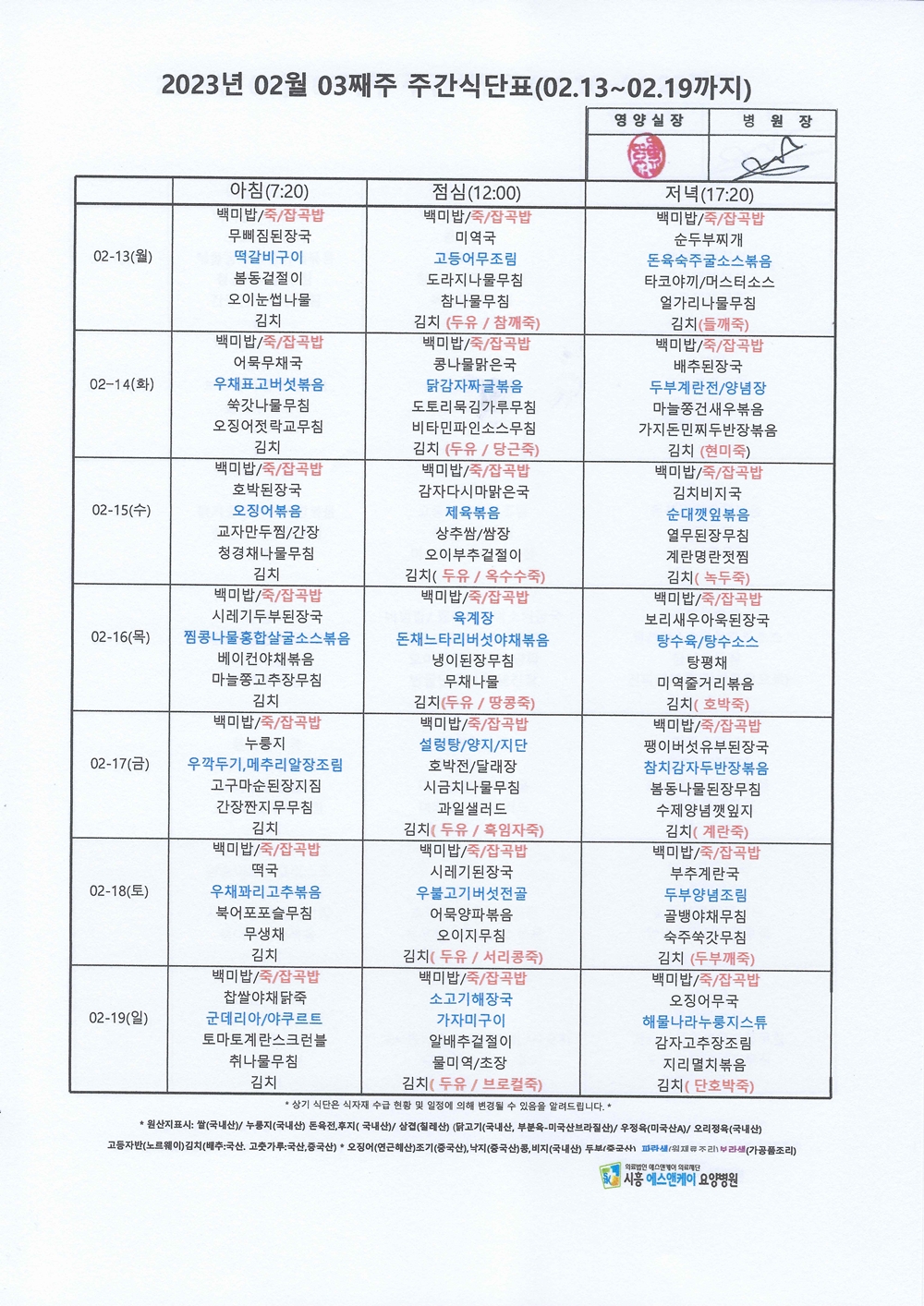 2023년 2월 3째주 주간식단표