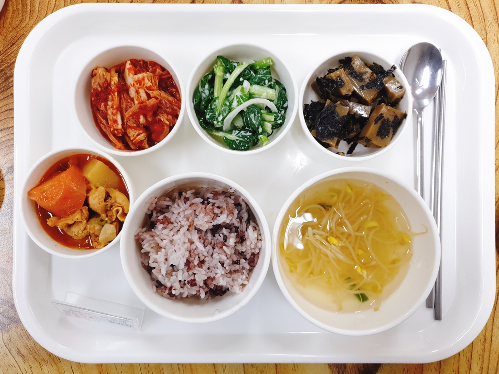 02월 14일 중식은 < 백미밥(죽/잡곡밥) / 콩나물맑은국 / 닭감자짜글볶음 / 도토리묵김가루무침 / 비타민파인소스무침 / 김치 > 였습니다.