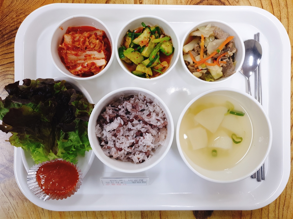 02월 15일 중식은 < 백미밥(죽/잡곡밥) / 감자다시마맑은국 / 제육볶음 / 상추쌈&쌈장 / 오이부추겉절이 / 김치 > 였습니다.