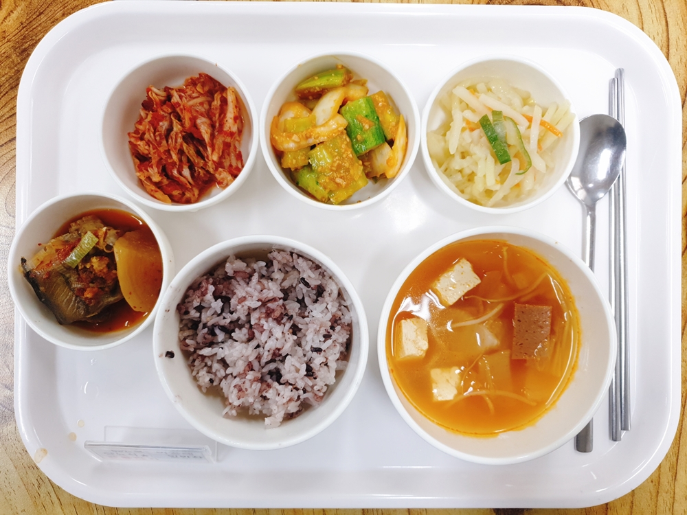 02월 21일 중식은 < 백미밥(죽/잡곡밥) / 부대찌개 / 코다리무조림 / 감자채볶음 / 오이양파쌈장무침 / 김치 > 였습니다.