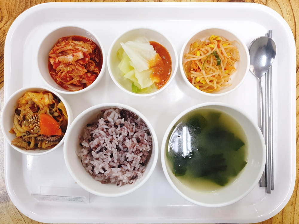 02월 23일 중식은 < 백미밥(죽/잡곡밥) / 미역국 / 쭈꾸미돈육야채볶음 / 양배추쌈&쌈장 / 콩나물무침 / 김치 > 였습니다.