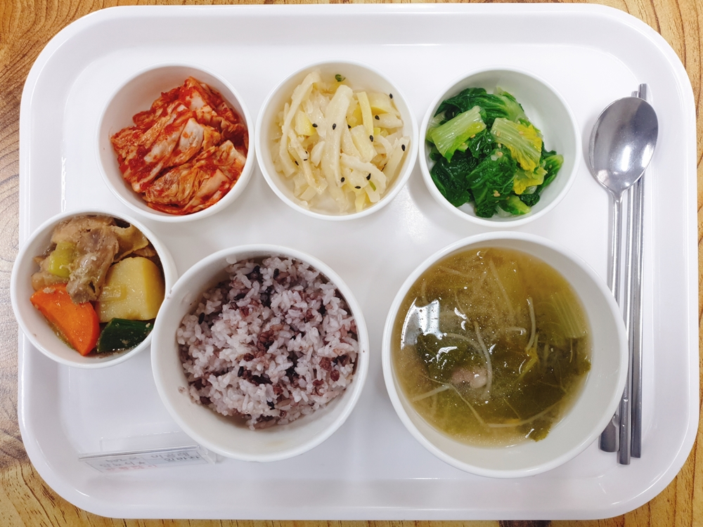 02월 27일 중식은 < 백미밥(죽/잡곡밥) / 소고기해장국 / 안동찜닭 / 봄동나물무침 / 도라지생채 / 김치 > 였습니다.