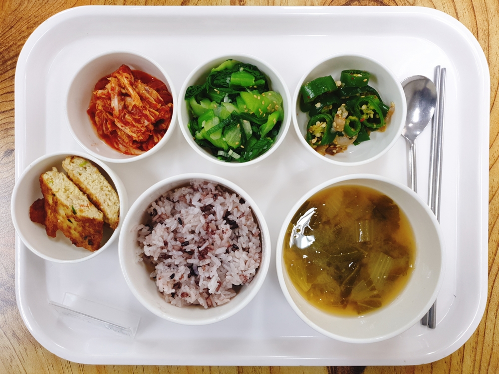 01월 30일 중식은 < 백미밥(죽/잡곡밥) / 얼가리된장국 / 돈두부전 / 청경채나물무침 / 풋고추조개살무침 / 김치 > 였습니다.