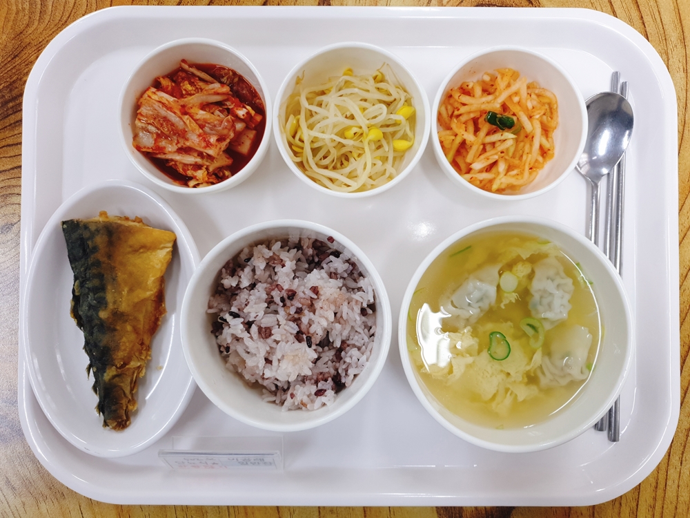 02월 01일 중식은 < 백미밥(죽/잡곡밥) / 만두국 / 고등어자반구이 / 콩나물무침 / 무생채 / 김치 > 였습니다.