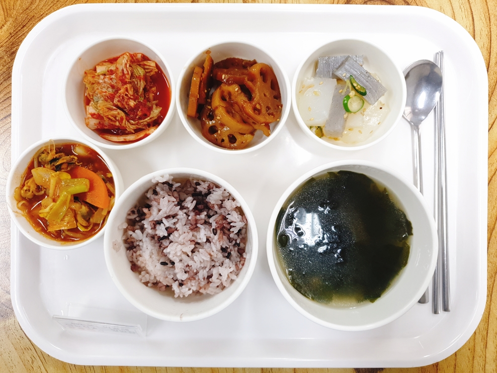 02월 07일 중식은 < 백미밥(죽/잡곡밥) / 미역국 / 해물찜 / 모듬묵무침 / 연근땅콩조림 / 김치 > 였습니다.