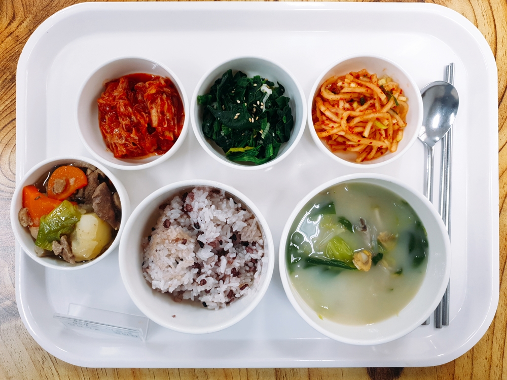 01월 04일 중식은 < 백미밥(죽/잡곡밥) / 나가사끼해장국 / 오리감자볶음 / 시금치나물무침 / 무생채 / 김치 > 였습니다.