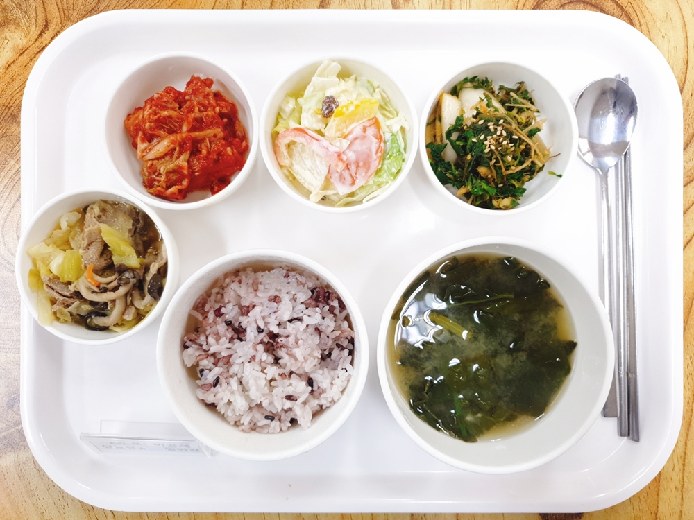 01월 13일 중식은 < 백미밥(죽/잡곡밥) / 시금치된장국 / 돈불고기 / 양상추3색파프리카샐러드 / 냉이된장무침 / 김치 > 였습니다.