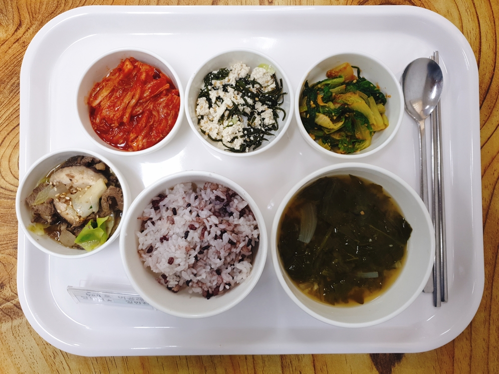 12월 16일 중식은 < 백미밥(죽/잡곡밥) / 열무된장국 / 우버섯전골 / 얼가리된장무침 / 톳두부무침 / 김치 > 였습니다.