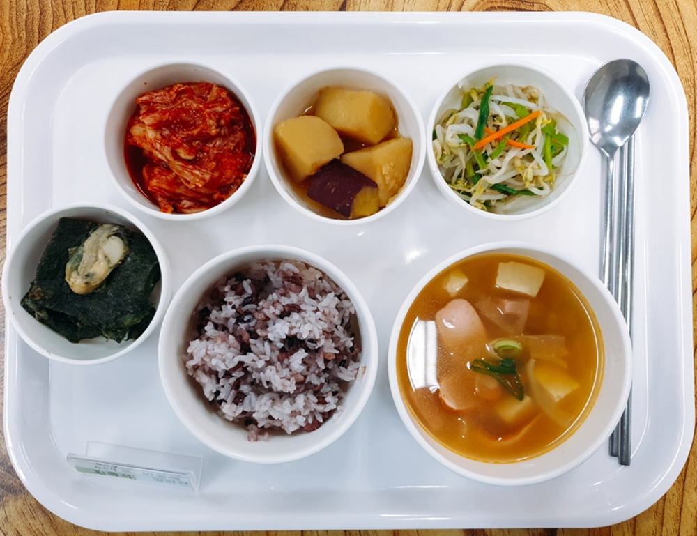 12월 26일 중식은 < 백미밥(죽/잡곡밥) / 부대찌개 / 매생이굴전&간장 / 미나리숙주나물무침 / 감자고구마조림 / 김치 > 였습니다.