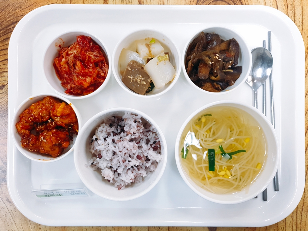 12월 27일 중식은 < 백미밥(죽/잡곡밥) / 콩나물맑은국 / 닭튀김&양념소스 / 가지두반장볶음 / 모듬묵김가루무침 / 김치 > 였습니다.