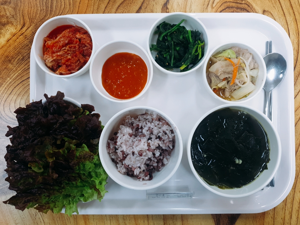 12월 28일 중식은 < 백미밥(죽/잡곡밥) / 미역국 / 대패삼겹숙주볶음 / 상추쌈&쌈장 / 시금치나물무침 / 김치 > 였습니다.