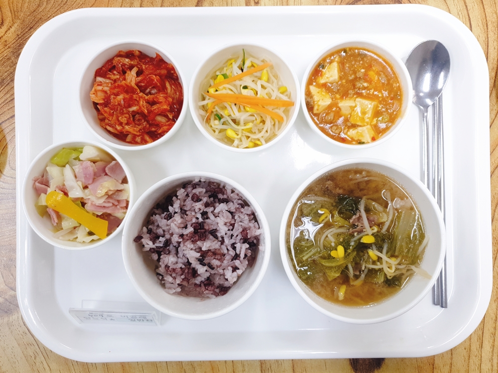 11월 28일 중식은 < 백미밥(죽/잡곡밥) / 소고기해장국 / 마파두부 / 양배추베이컨야채볶음 / 콩나물무침 / 김치 > 였습니다.