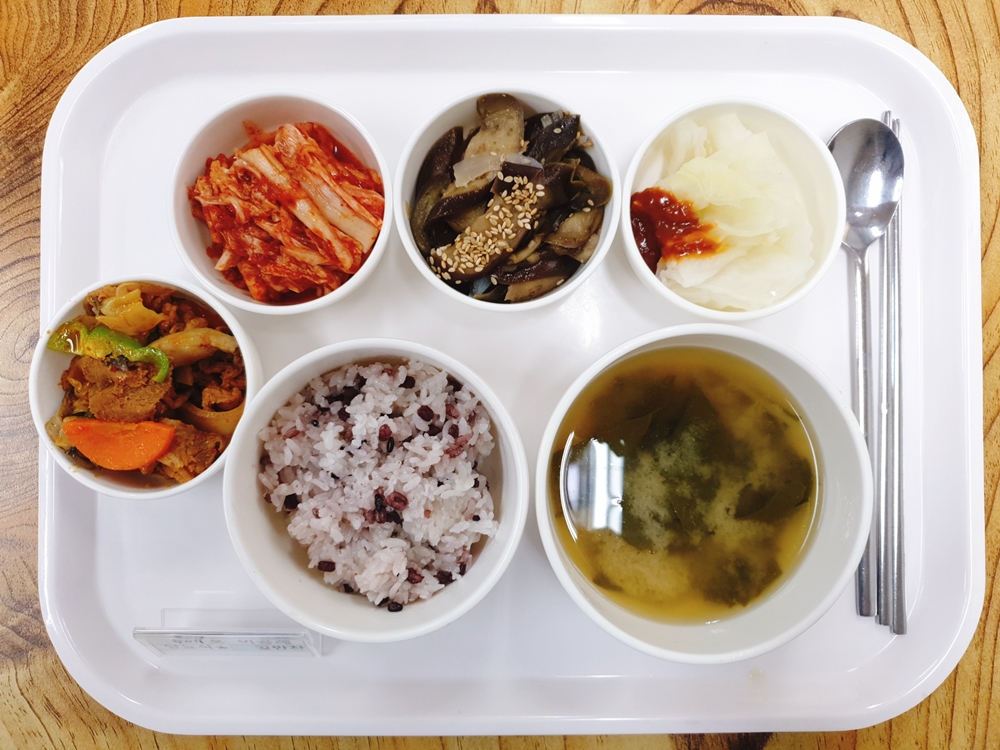 12월 01일 중식은 < 백미밥(죽/잡곡밥) / 근대된장국 / 돈불고기 / 양배추쌈&쌈장 / 가지나물볶음 / 김치 > 였습니다.