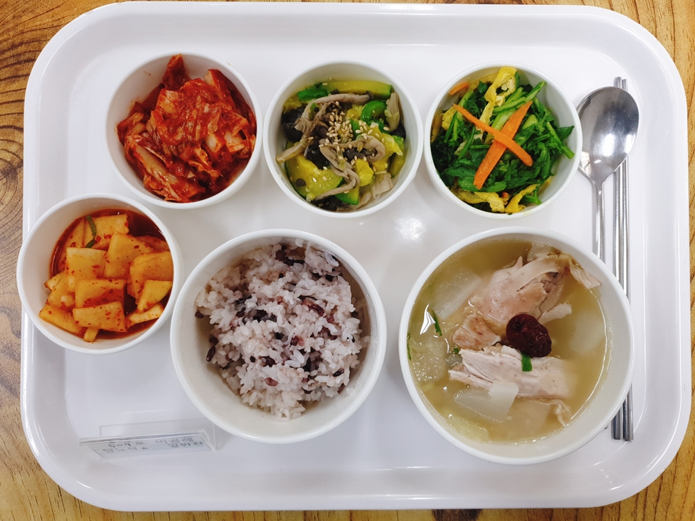 12월 05일 중식은 < 백미밥(죽/잡곡밥) / 한방백숙탕 / 애호박버섯볶음 / 유부쑥갓무침 / 무깍두기 / 김치 > 였습니다.