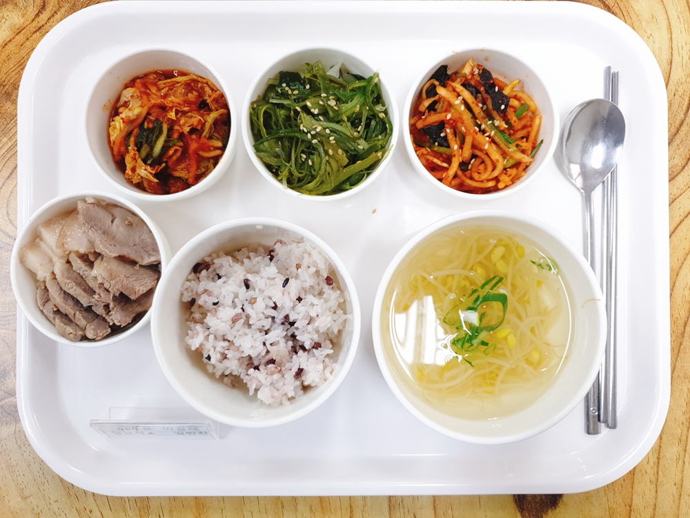 12월 09일 중식은 < 백미밥(죽/잡곡밥) / 콩나물맑은국 / 돈수육&새우젓 / 미역줄거리 / 굴김장김치 / 무생채 / 김치 > 였습니다.