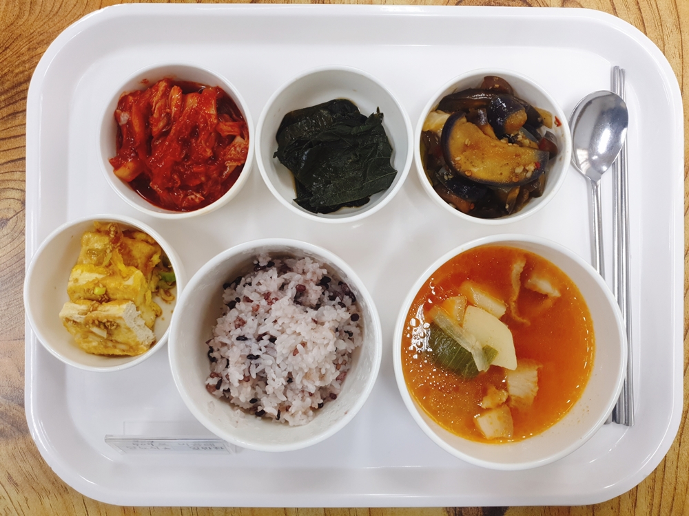 12월 12일 중식은 < 백미밥(죽/잡곡밥) / 돈육고추장찌개 / 두부계란전&양념장 / 가지두반장볶음 / 간장깻잎지 / 김치 > 였습니다.