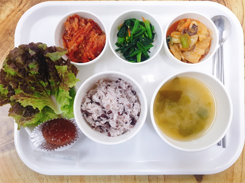 12월 13일 중식은 < 백미밥(죽/잡곡밥) / 알갈이된장국 / 쭈꾸미삼겹살볶음 / 상추쌈&쌈장 / 포항초나물무침 / 김치 > 였습니다.
