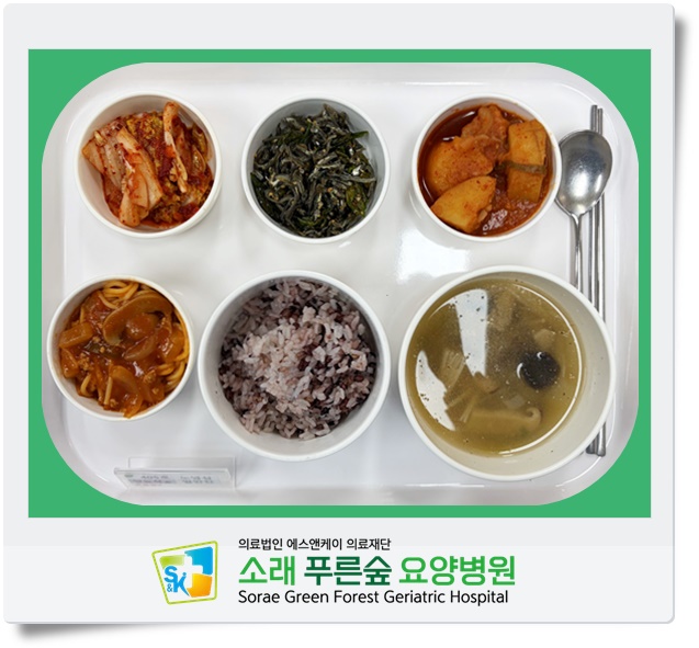 ▷ 1월 12일 중식 : 백미밥(죽/잡곡밥) / 버섯들깨탕 / 스파게티 / 꽈리고추멸치볶음 / 감자당근조림 / 김치 ◁