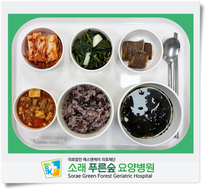 ▷ 1월 13일 중식 : 백미밥(죽/잡곡밥) / 북어채미역국 / 메밀전병 / 마파두부 / 유채나물된장무침 / 김치 ◁