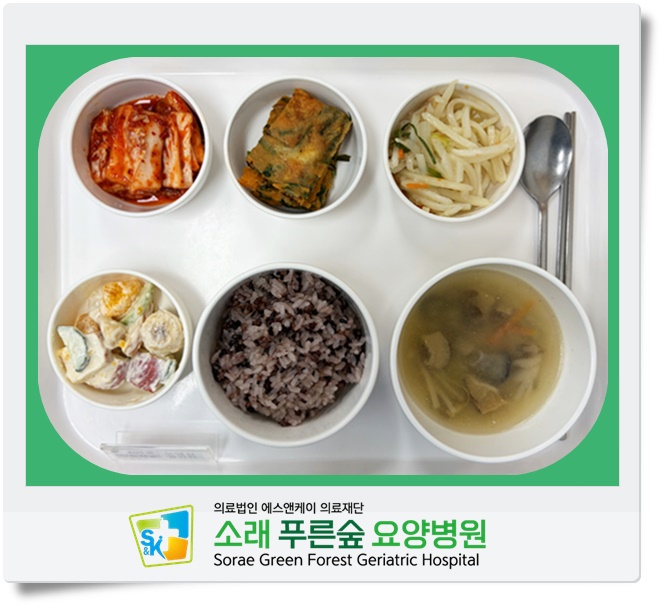 ▷ 1월 22일 중식 : 백미밥(죽/잡곡밥) / 버섯들깨탕 / 부추장떡 / 감자채볶음 / 과일샐러드 / 김치 ◁