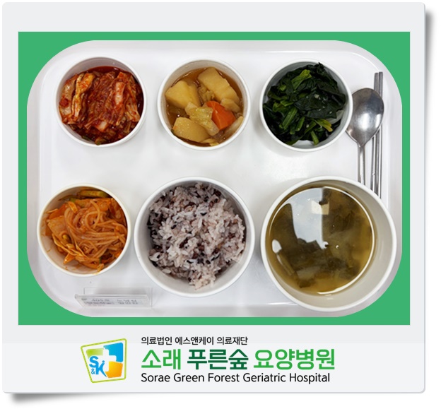 ▷ 1월 28일 중식 : 백미밥(죽/잡곡밥) / 근대된장국 / 쫄면야채무침 / 감자당근조림 / 시금치무침 / 김치 ◁
