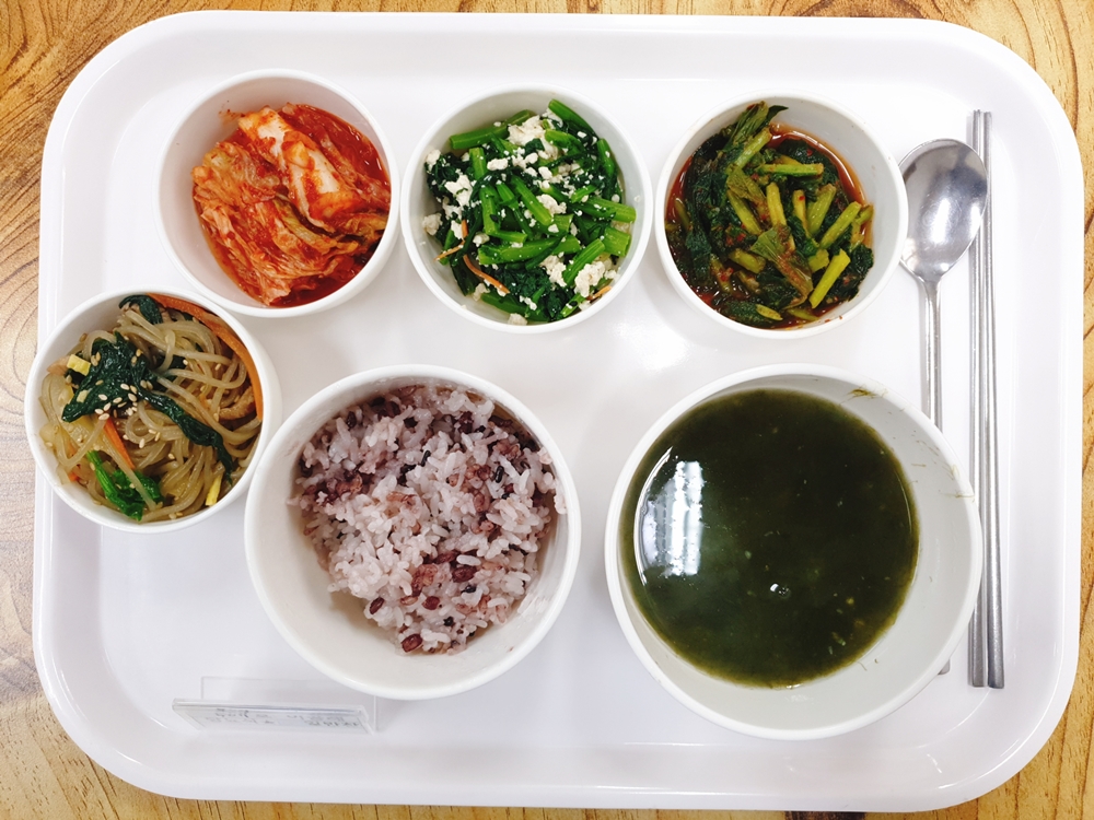 11월 10일 중식은 < 백미밥(죽/잡곡밥) / 매생이떡국 / 한식잡채 / 쑥갓두부흑임자무침 / 갓김치 / 김치 > 였습니다.