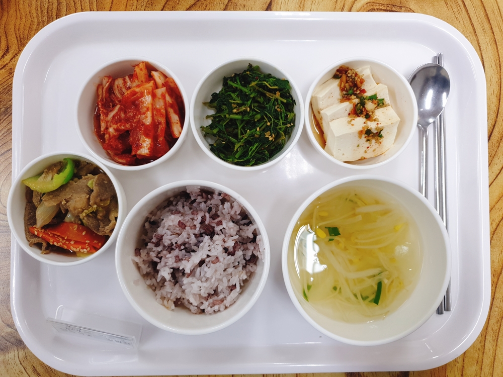 11월 14일 중식은 < 백미밥(죽/잡곡밥) / 콩나물무국 / 돈육두루치기 / 온두부&양념장 / 비름나물된장무침 / 김치 > 였습니다.