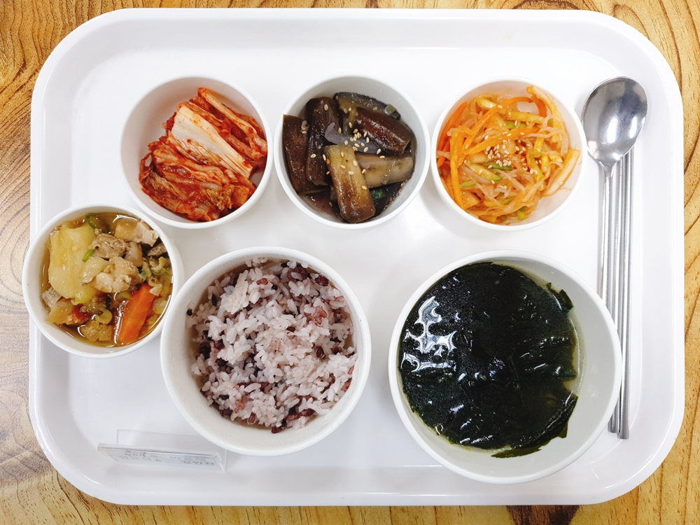 11월 18일 중식은 < 백미밥(죽/잡곡밥) / 미역국 / 닭감자간장조림 / 실곤약야채초무침 / 가지볶음 / 김치 > 였습니다.